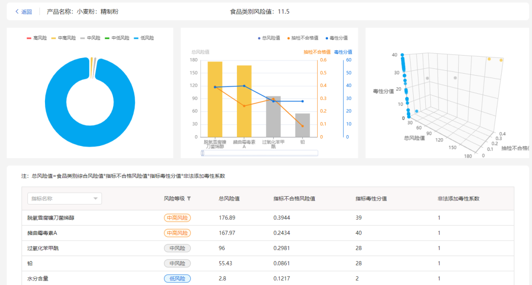 通过各种图表进行指标风险等级、抽检不合格风险以及指标毒性风险的可视化呈现,帮助快速了解产品品类及指标风险,合理进行风险管控。